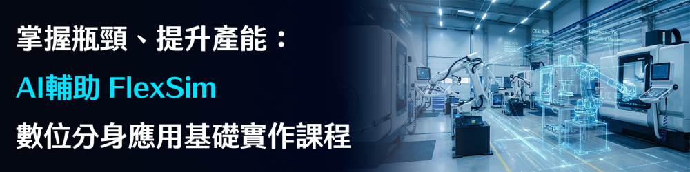 FlexSim 數位分身(Digital Twin)模擬技術為核心,結合 AI 導向的流程分析與數據決策思維,帶領學員從零開始建構智慧自動化產線模型。透過虛擬模擬環境,完整呈現機台運作狀態、上下料與搬運邏輯、自動排程規則與系統互動關係,協助學員全面理解產線的動態行為。
